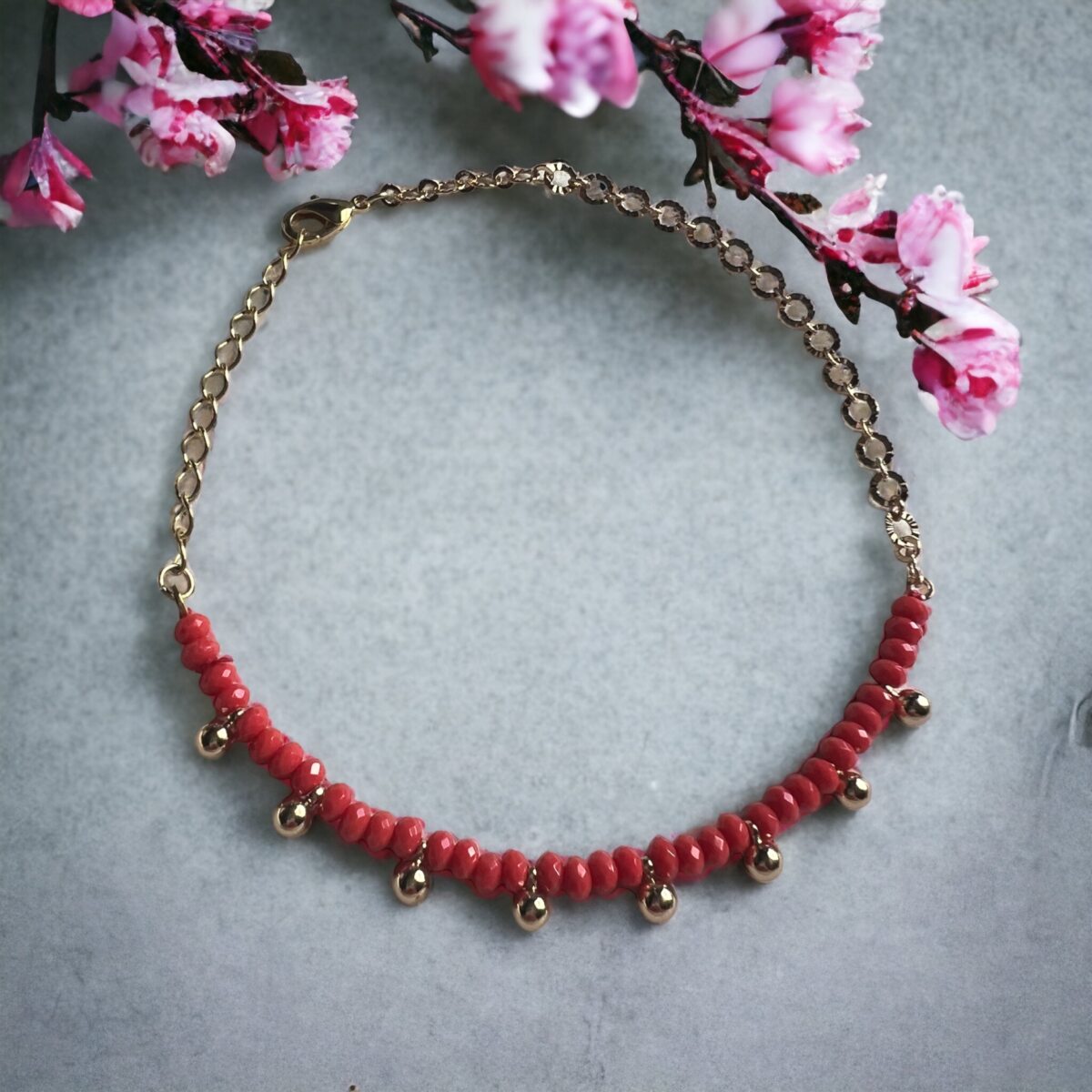 Anklet with polka dots and coral crystals plated in 18k gold.